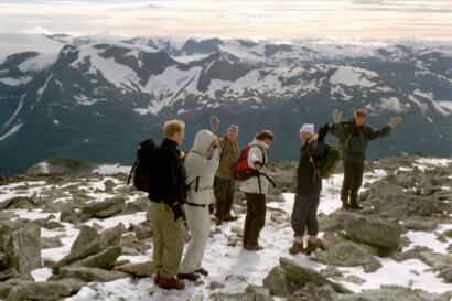 Fredag kl. 06.30 var det vekking - pakking - frokost - og deretter busstur til Loen. En siste "proviantering" - og så bar det oppover. Siw, Jon, Magne, Arne, Geir og Lise valgte å gå ned igjen samme dag.