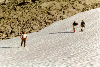 Lørdag kl. 06.00 våknet de fleste. Dels av urolig søvn - dels av snakkesalige kvinner (Marianne). . . Vi inntok en lett frokost, ryddet, pakket og dro nedover. Nedturen ble spennende - og vond for noen. Det gikk raskt nedover - vi seilte på snøen - og noen for fort. Men vi kom alle ned uten alvorlige skader. Etter altfor lite uttøyning bar det til Førde og Sunnfjord hotell. Stemningen var høy - (noen hadde det vondt - til andre skadefro. ..) På hotellet ble det bading (på noen) - før champagnen kom på bordet - og vi feiret oss selv. Maten var utmerket - og drikken likeså. I danserestauranten holdt de fleste ut lenge - noen gikk til sengs - mens andre diskuterte turen (og andre turer). |