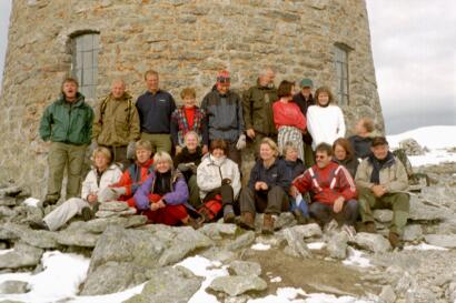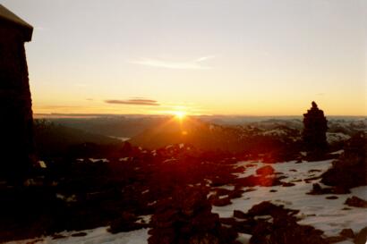 Vi andre fyrte godt (i ovnen). Eli og Solveig "disket opp" med mat m.m. som vi andre hadde båret opp. Etter å ha inntatt mat og drikke ble det sang (og mer drikke) før vi forberedte oss på solenedgangen (i 1848 meter over havet). Et fantastisk syn! Senere bar det til sengs - på hemsen - i 3 etasjes "sirkelsenger". Da vi var vel i seng - dukket det opp 4 jenter - midt på natten. Dumdristig å "karré seg opp" til tårnet etter mørkets frembrudd - men det gikk bra. |